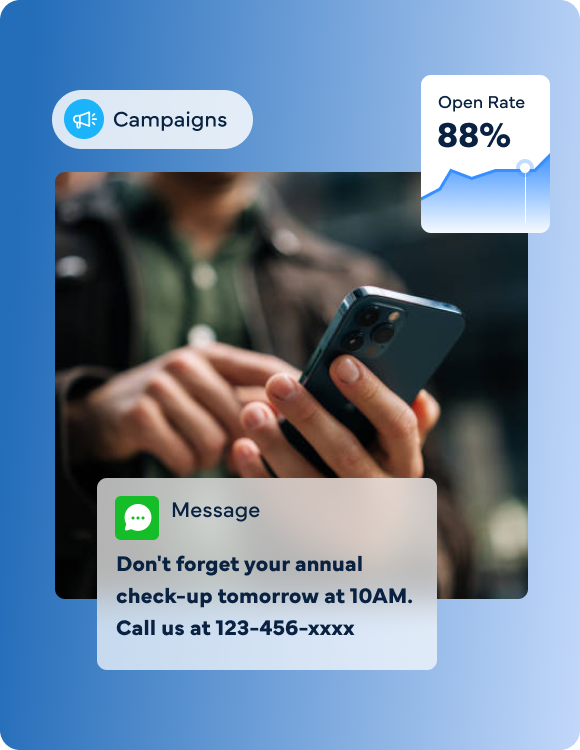 Send targeted texts to patient segments: reactivation offers, promotions, event invites, last-minute openings. 98% open rate. Patients respond and book directly.