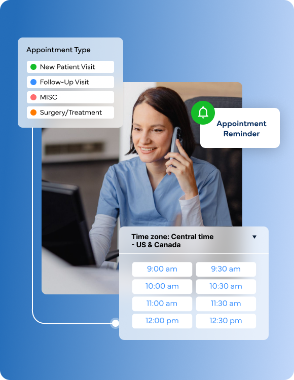 Custom appointment types, provider and location selection, smart availability, automated reminders, and AI-powered no-show recovery.