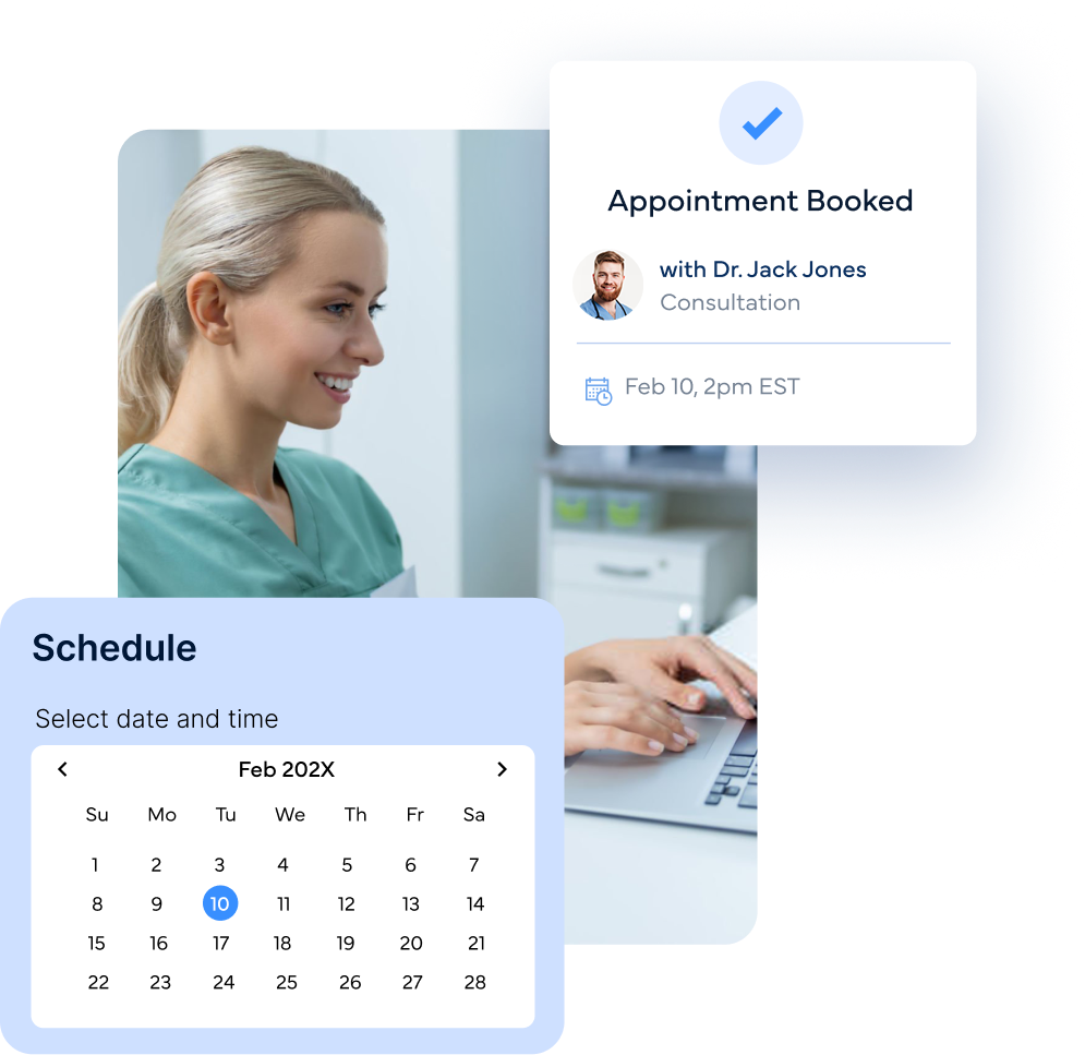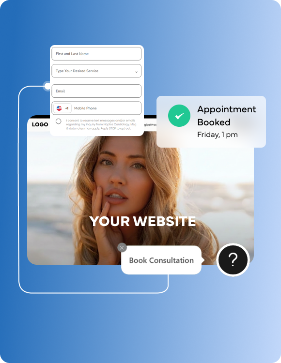 Embeddable booking flow for your website. Patients select a service, pick a provider, choose a time, and place a deposit, all without calling.
