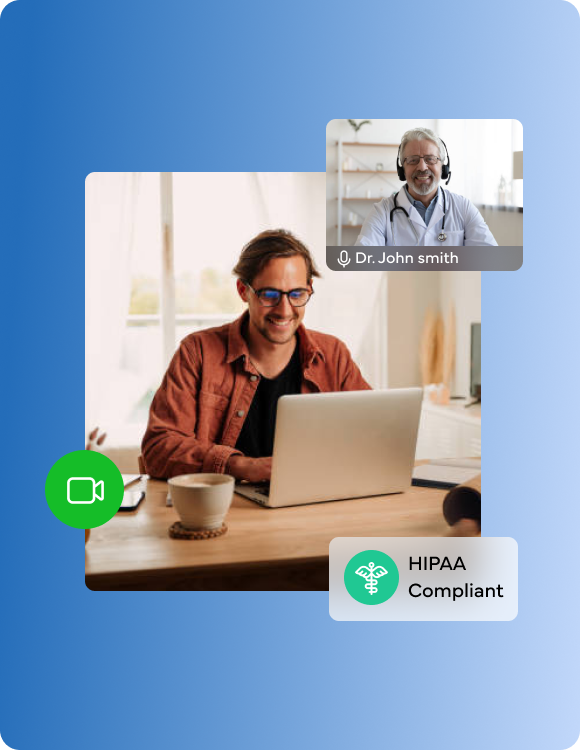 HIPAA-compliant, encrypted video calls. HD quality. Screen sharing available. Works on any browser — Chrome, Safari, Firefox — desktop or mobile.