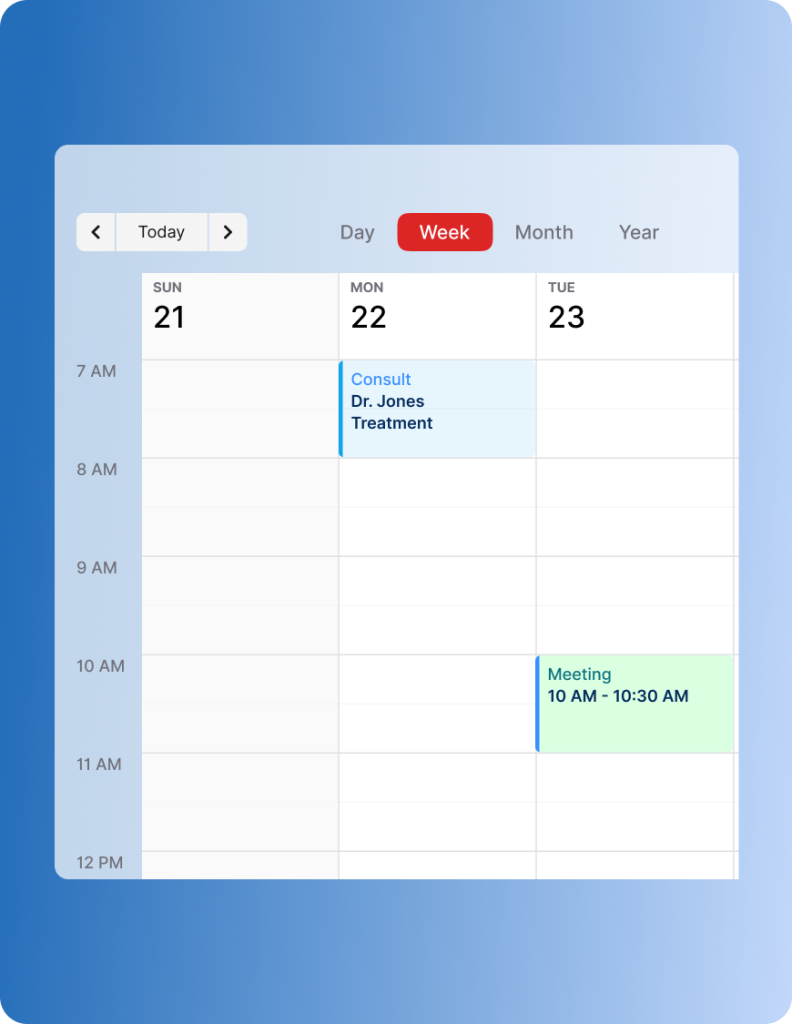 Calendar syncs with your EMR, your booking widget, and your AI Front Desk in real time. One source of truth. No manual updates. No double-bookings.